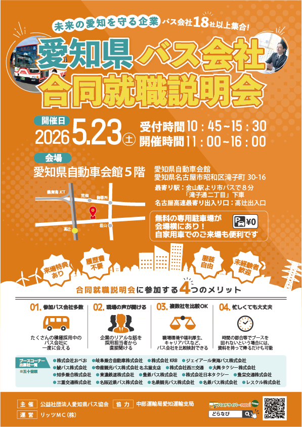 来る5月23日(土)、名古屋市で開催される「愛知県バス会社 合同就職説明会」に、当三河営業所(安城市)が初めて参加いたします!