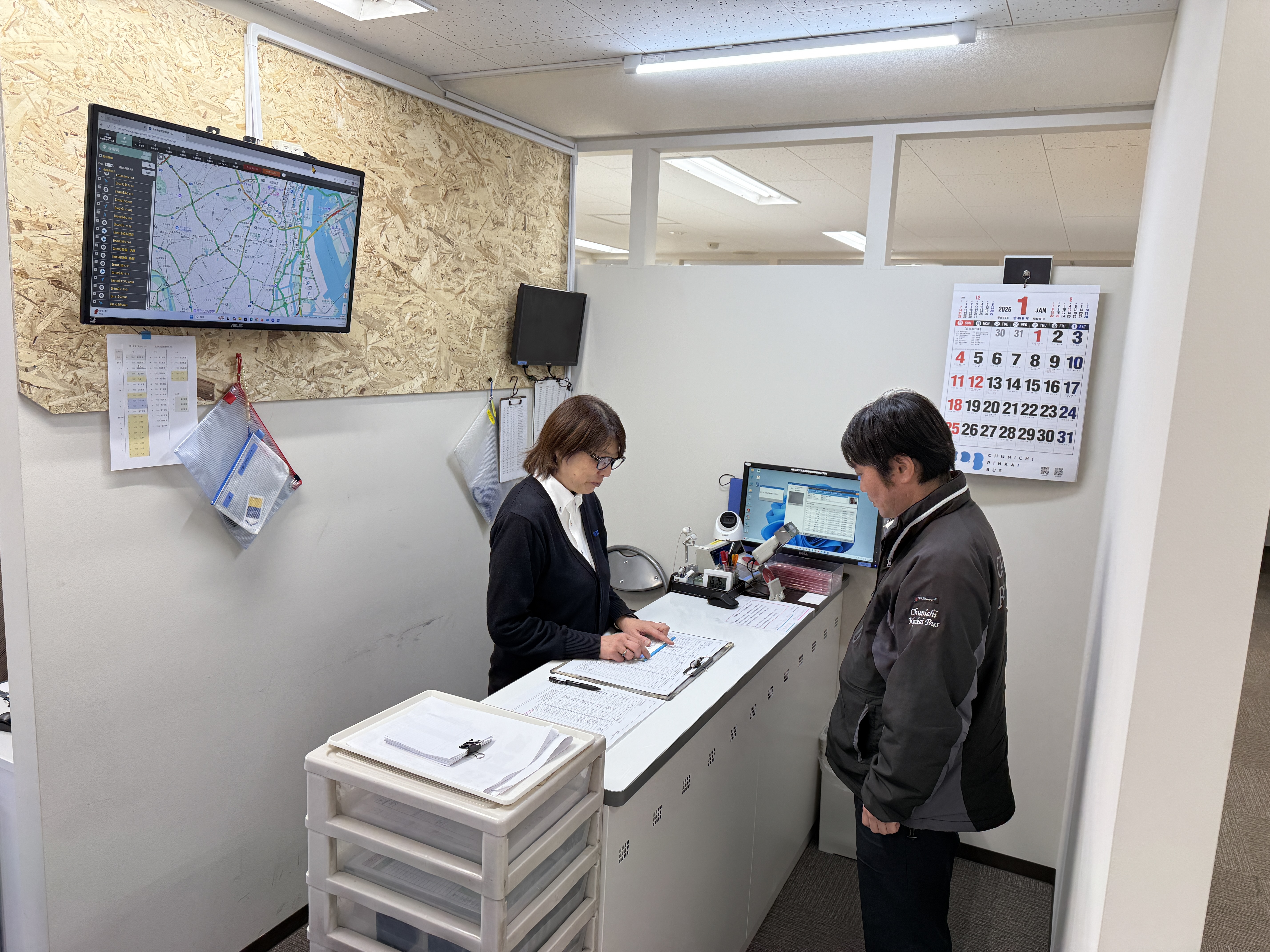 乗務員さんはここでアルコールチェックや健康状態の確認、運行経路・注意事項の共有を行い、万全の態勢で出庫していきます。新しい環境は動線もスムーズで、より丁寧な点呼が行えるようになりました。