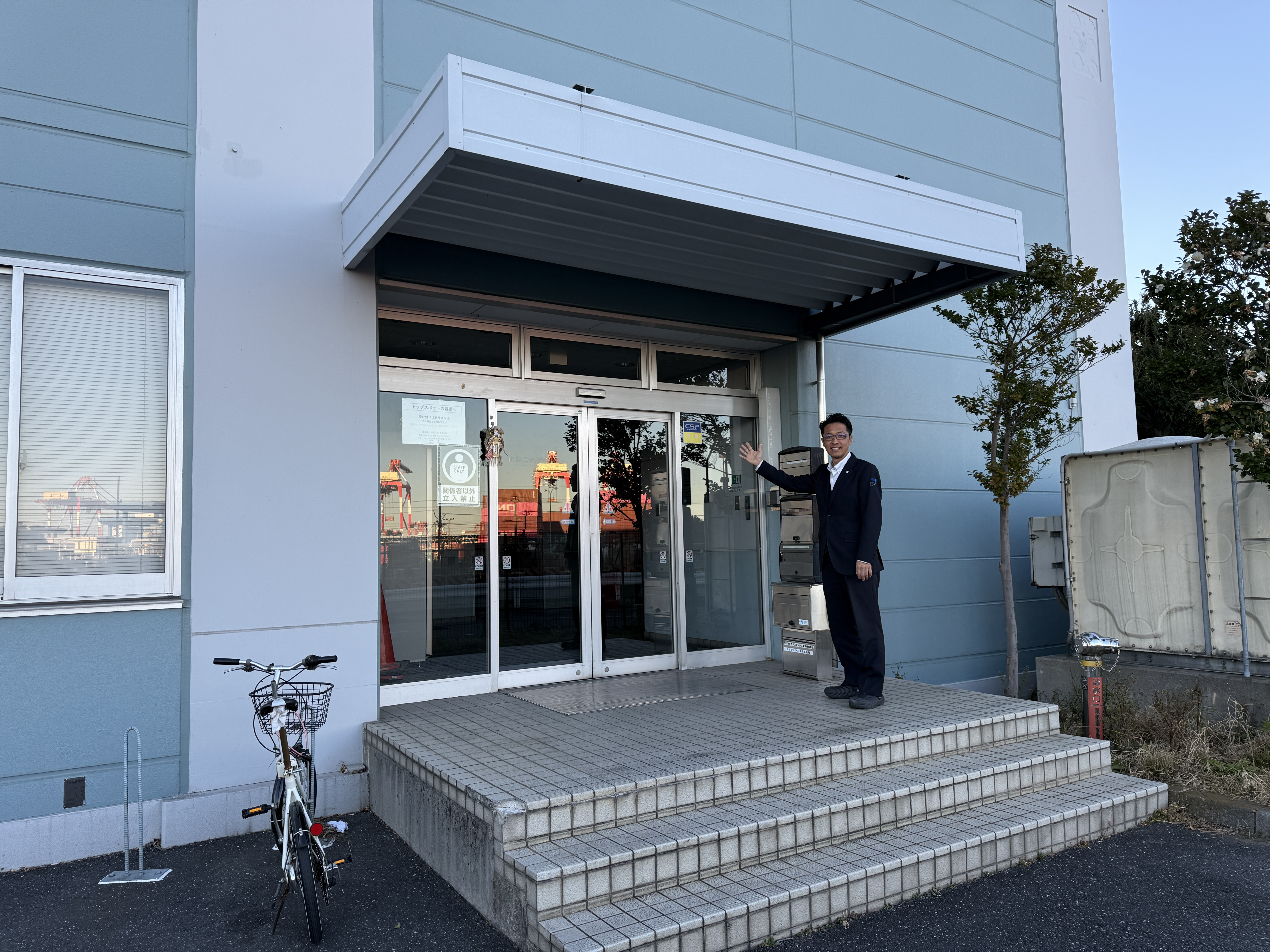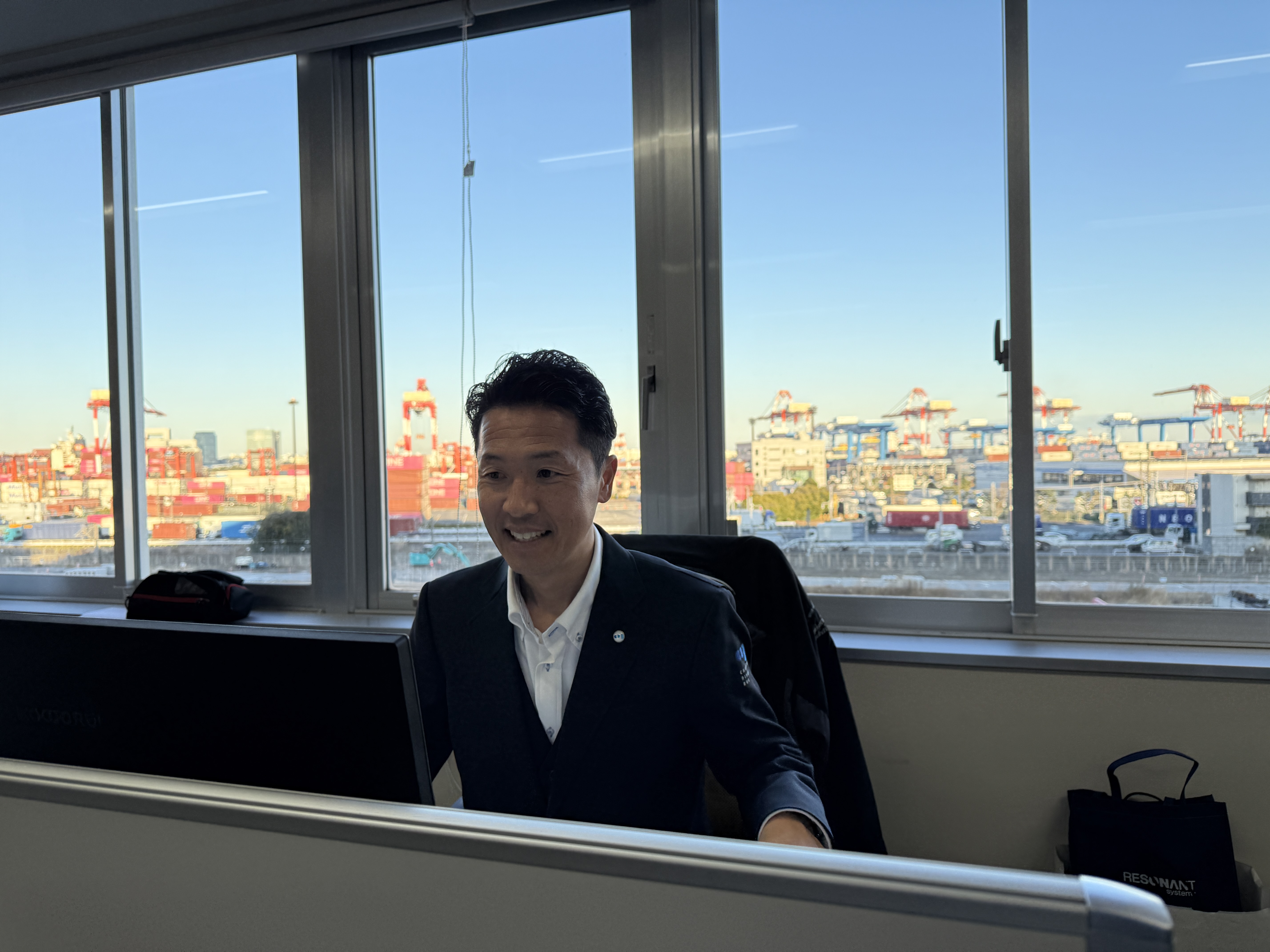 港湾エリアならではのダイナミックな景色を眺めながら、新しい拠点での挑戦に胸を躍らせています。
