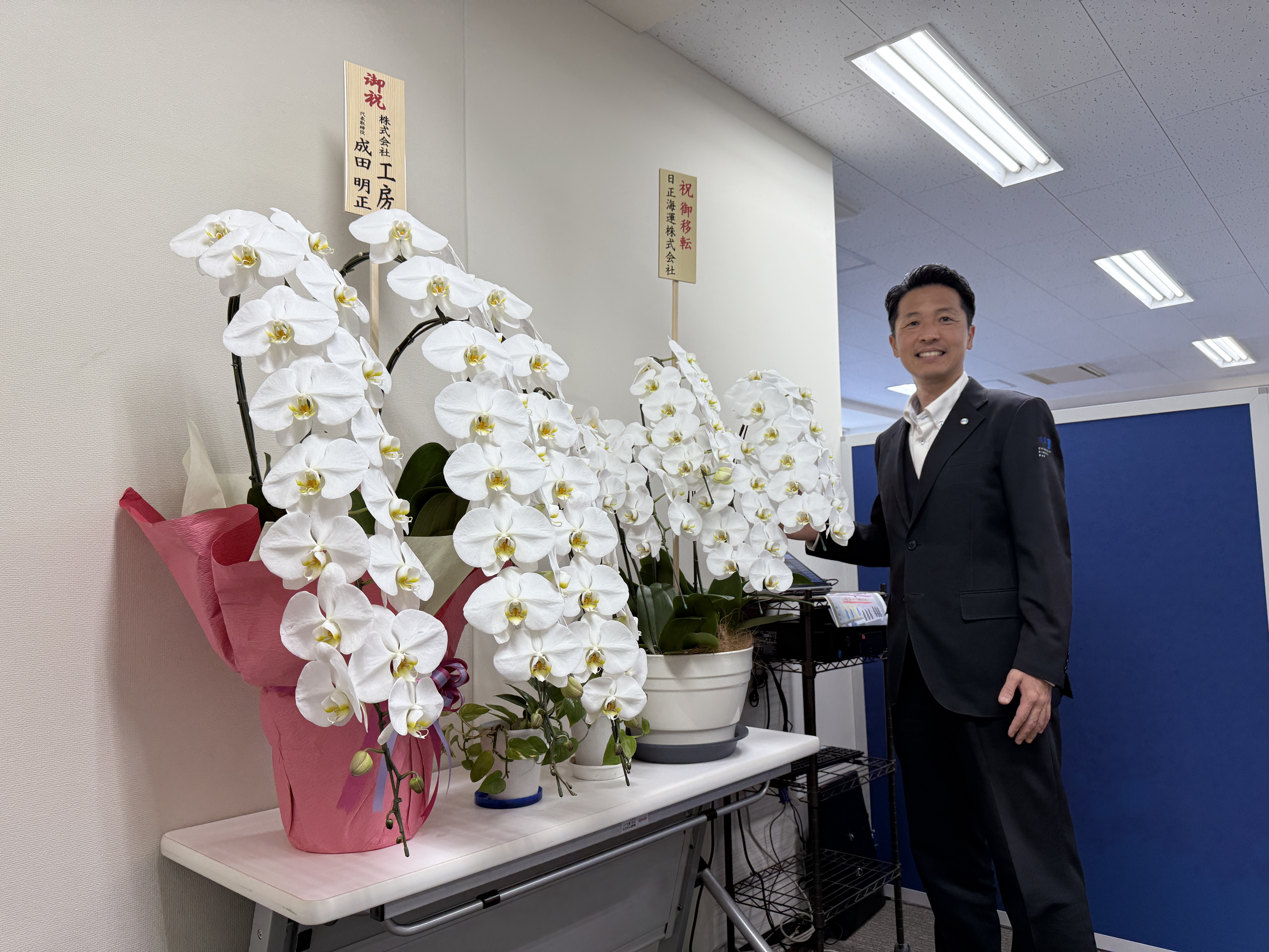 移転のお祝いとして、いただいた胡蝶蘭を飾っております。白い花が並ぶエントランスはとても華やかで、ご厚情に職員一同、身の引き締まる思いです。胡蝶蘭をお贈りくださいました皆さまに、この場をお借りして心より御礼申し上げます。