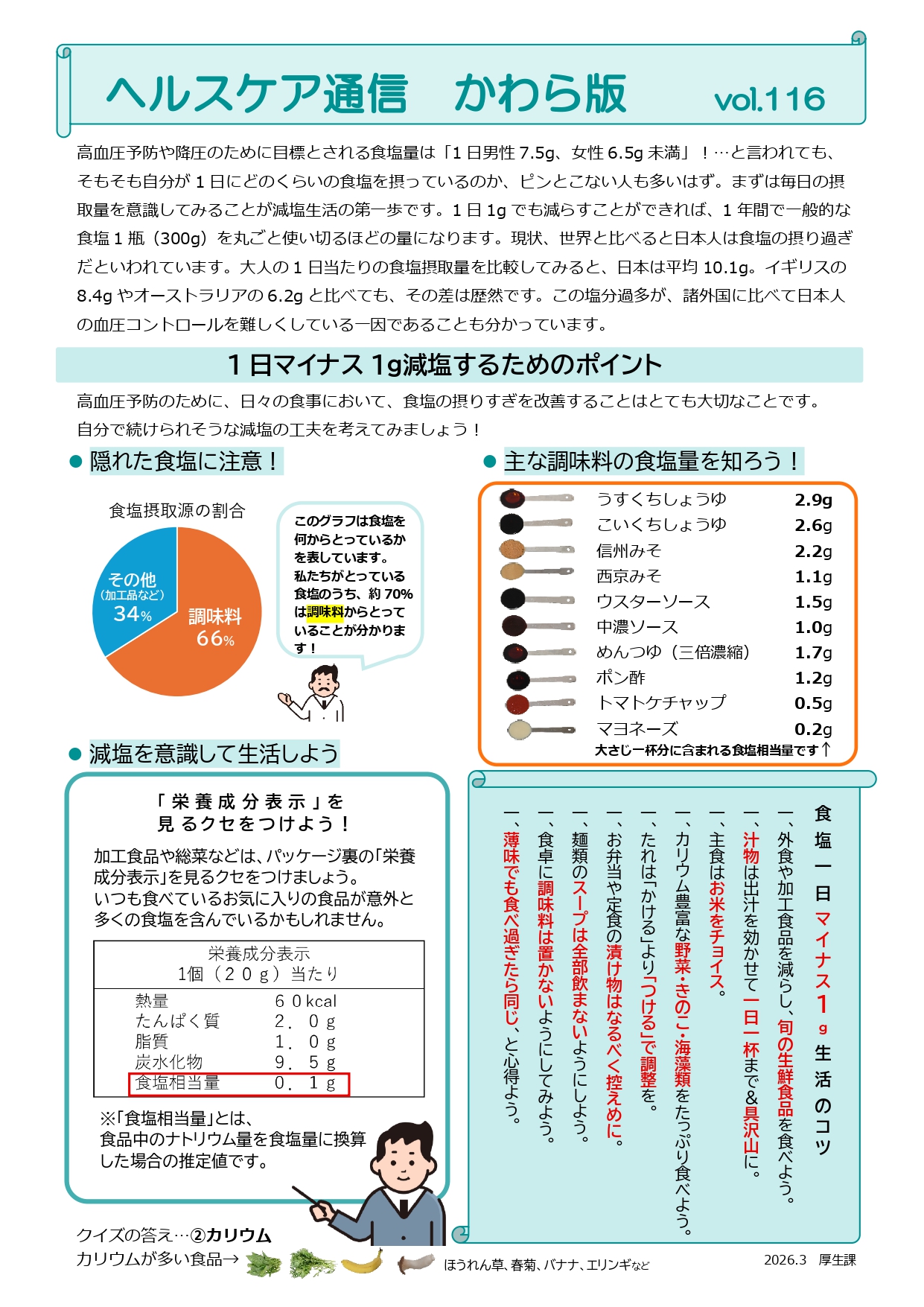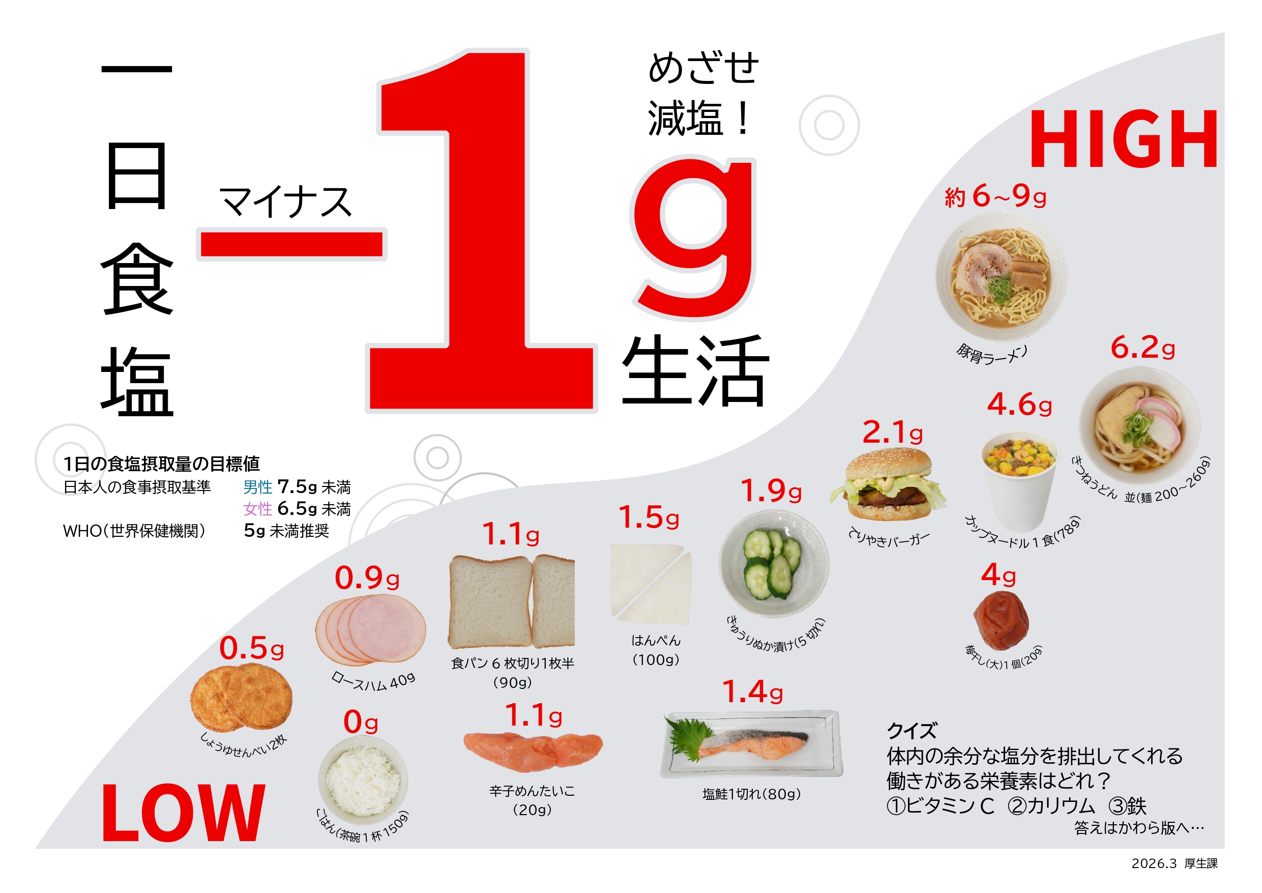 そこで今月は、皆さまも一緒に「1日マイナス1g」の減塩に挑戦してみませんか?