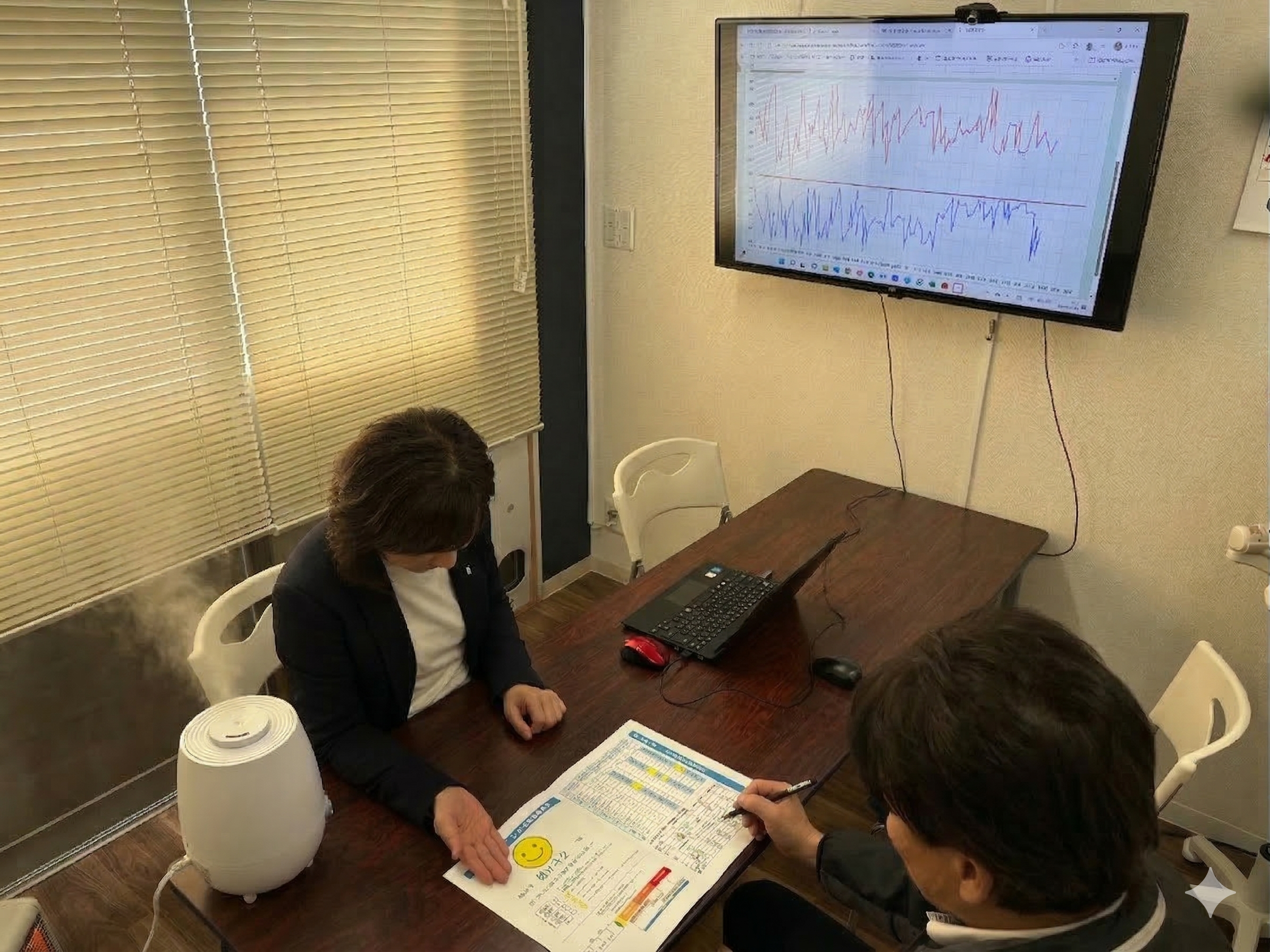 個別面談では、この日々の蓄積データと健康診断の結果を照らし合わせ、独自のマークで可視化した「ヘルスケア通信」を用いてフィードバックを行います。